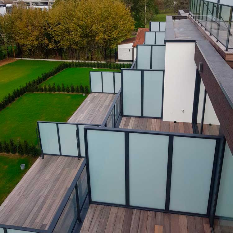 Met zijn strakke verticale spijlen behoort deze balustrade tot de toppers in ons gamma. Bij de samenstelling kunt u kiezen voor ronde of rechthoekige profielen, verticale spijlen die doorlopen tot op de voetplaat, een montage bovenop of voorop. De uitvoering is steeds in aluminium geanodiseerd of gelakt in RAL-kleur naar keuze. Kortom, met dit type balustrade selecteert u een strak en tijdloos concept.